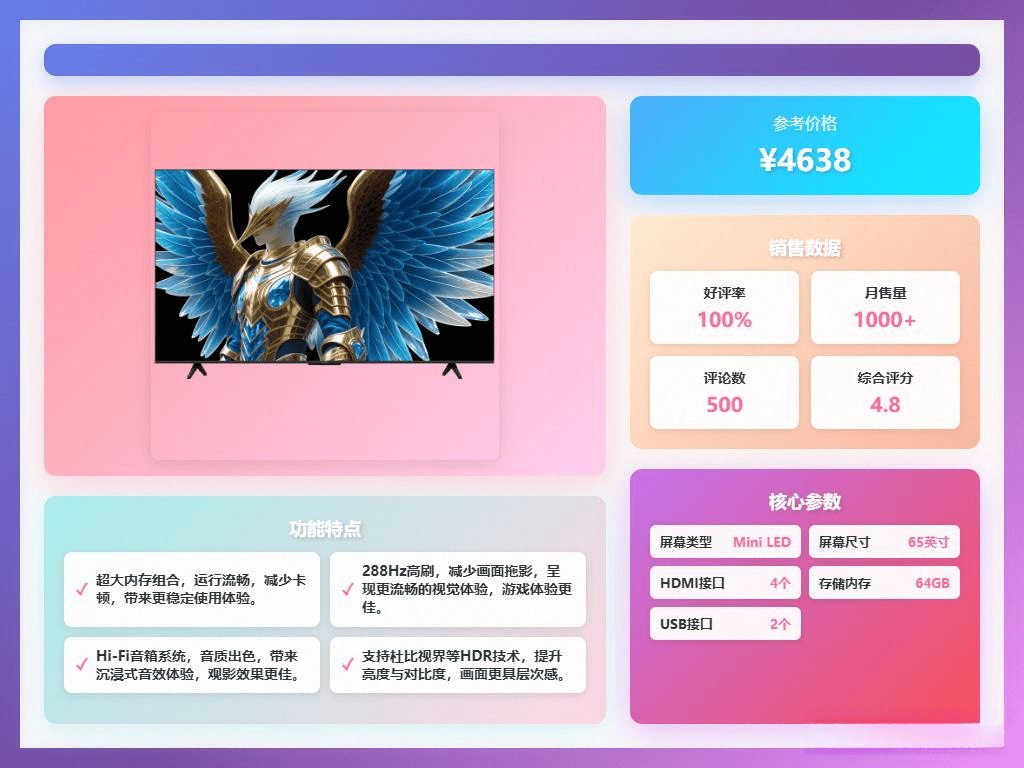 在色彩方面,这台电视拥有94% DCI-P3高色域,色彩显示丰富准确,沉浸感十足!而且它还支持多种HDR格式,比如杜比视界IQ、HDR 10+等,简直是影音爱好者的福音。此外,它还具备不少实用功能,如AI远场语音控制,动动嘴就能搞定,还有NAS私有云,直接观看局域网里的影片,超方便!再加上满血HDMI2.1接口、USB3.0接口等,拓展性也很强,使用起来相当顺手。