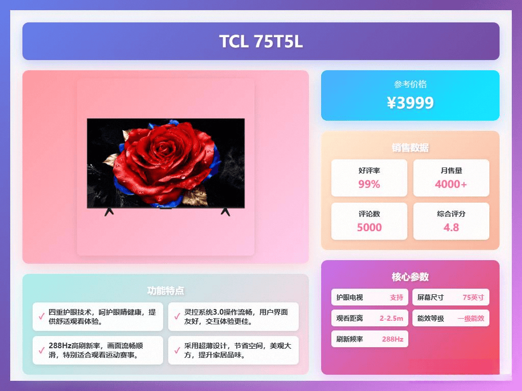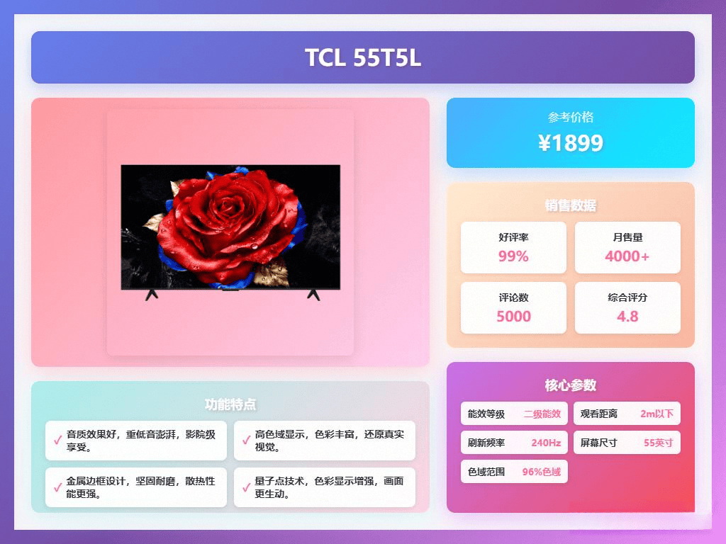 TCL这款电视的色彩表现力相当出色,采用TFT Pro 2025量子点技术,能够达到96%的超高色域。而且外观设计也颇具匠心,超薄一体化,加上航天级金属边框,显得相当精致,摆在客厅里绝对上档次。