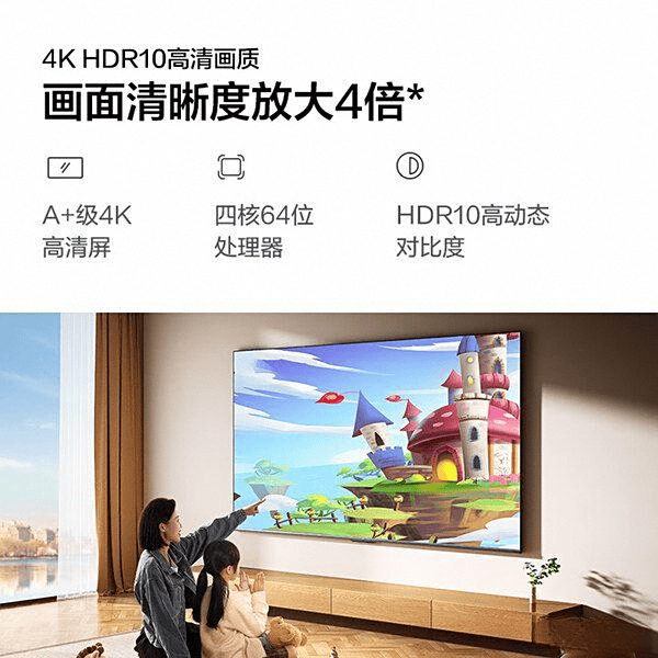 这款电视采用超高清4K HDR10技术,分辨率比传统电视提升了四倍,无论是观看电影、打游戏还是看体育赛事,都能呈现出细腻的画面和真实的色彩。内置杜比和DTS音效处理技术,确保提供沉浸式的音效享受,非常适合家庭影院爱好者。它同时具备TÜV莱茵低蓝光护眼认证和无频闪技术,特别关注视力健康,即使长时间观看也不会感到眼睛疲劳,且儿童护眼模式更是适合家中有小朋友的家庭。