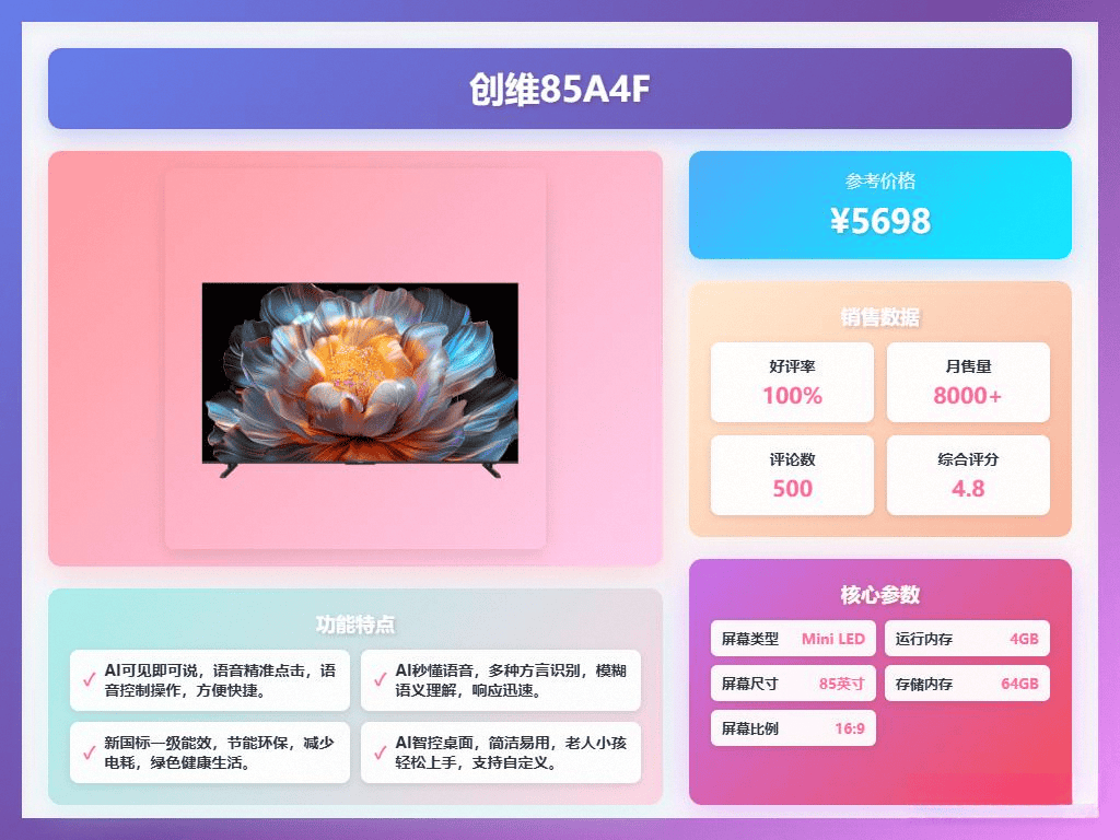 创维85A4F采用了先进的Mini LED技术,背光控制精准,画面对比度和亮度表现优异,色彩更加鲜艳。它的AI画质引擎能够智能优化画面,让细节更加清晰,观看体验极佳。